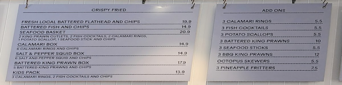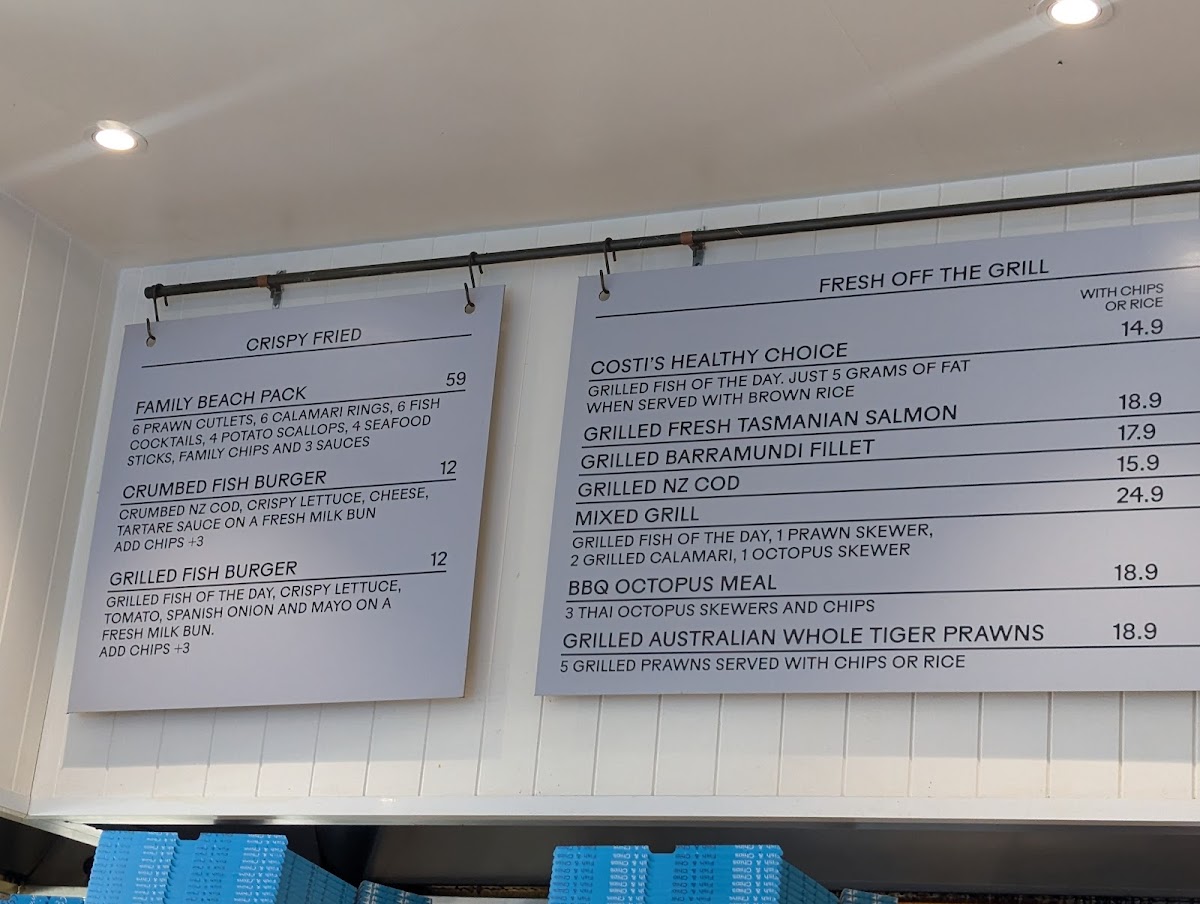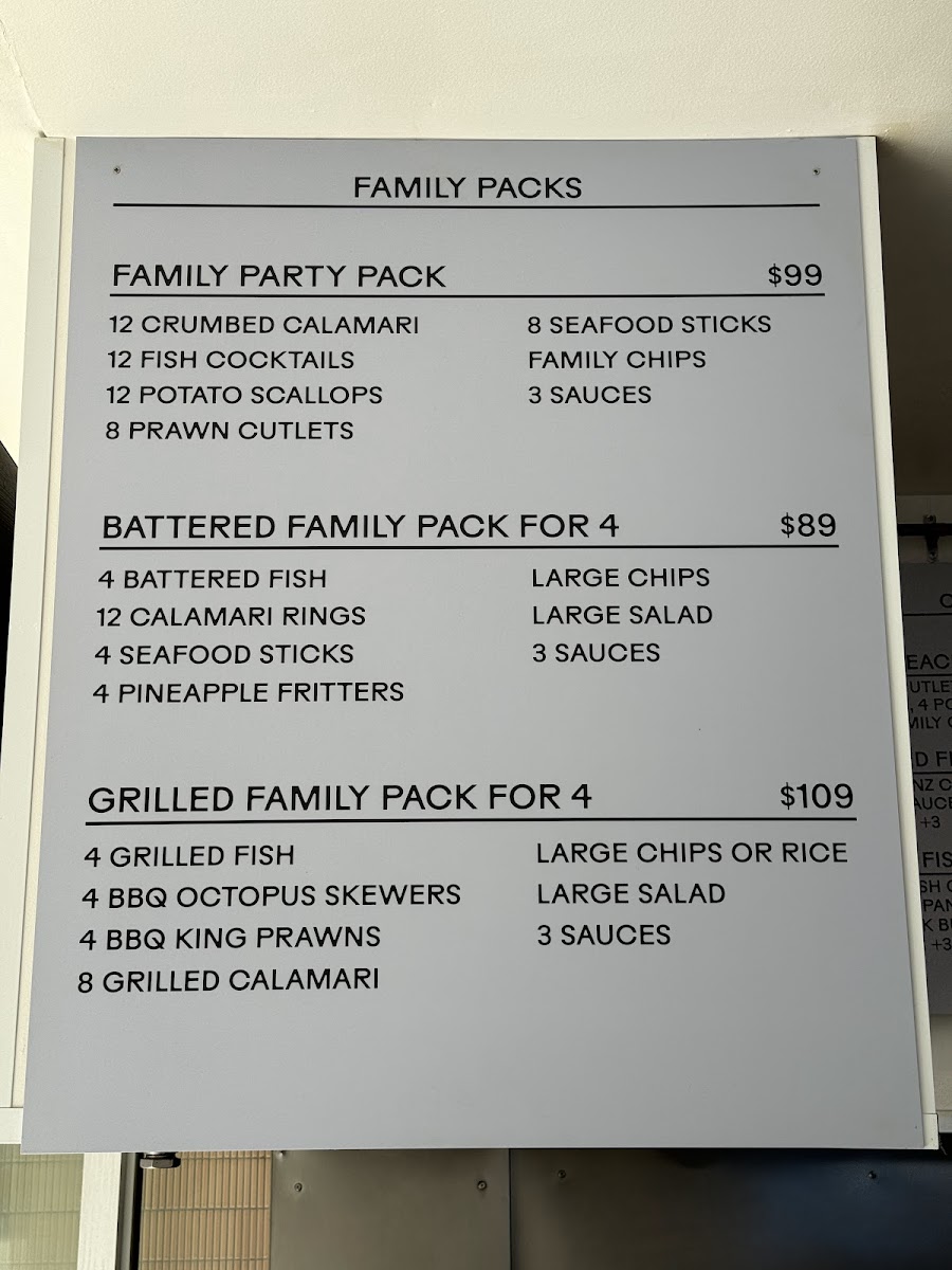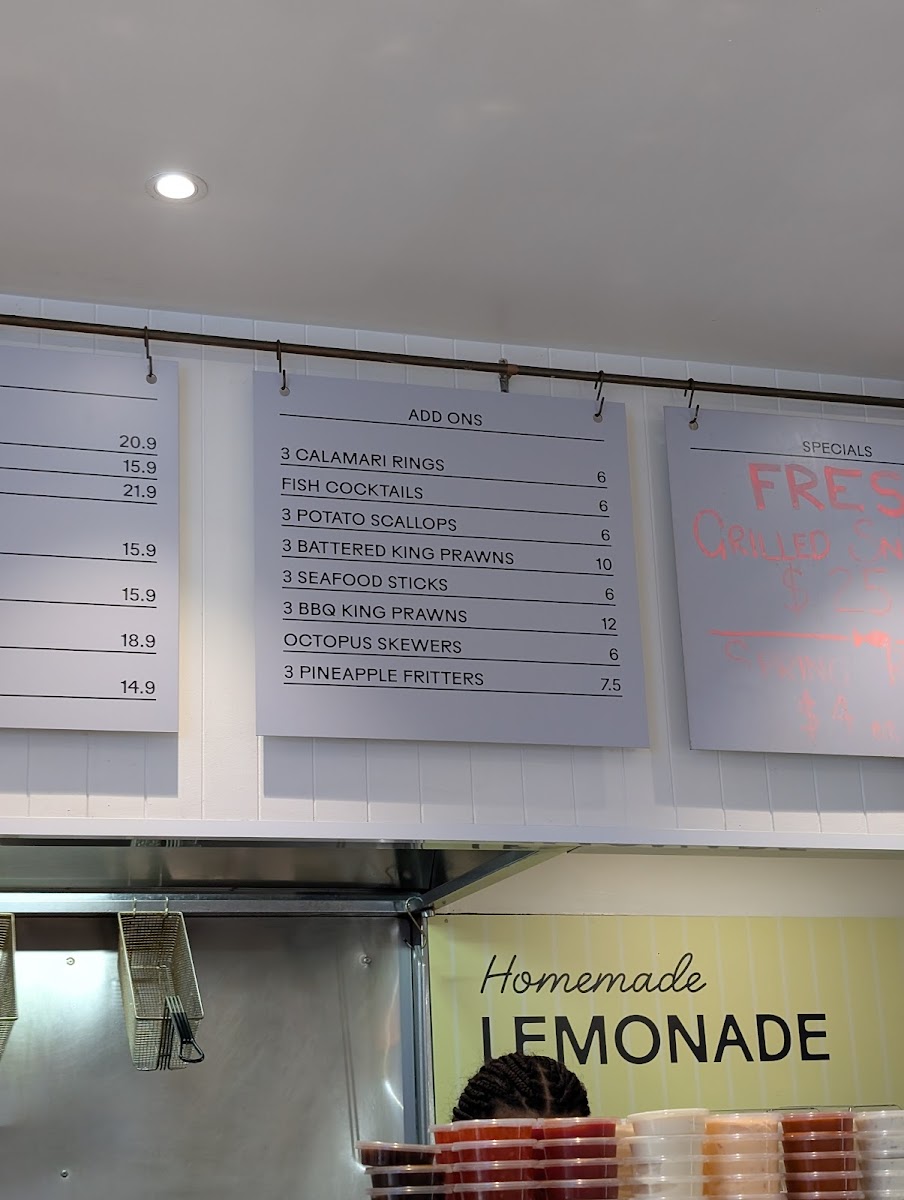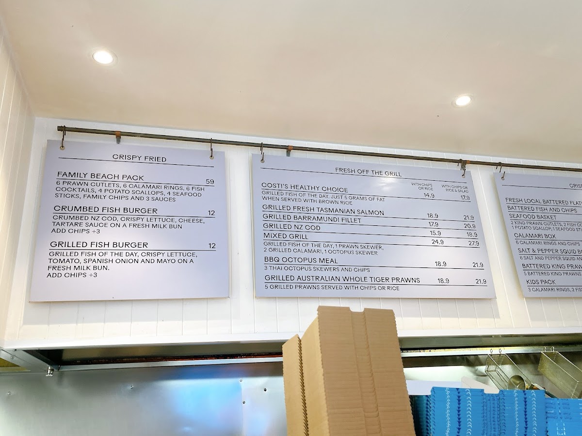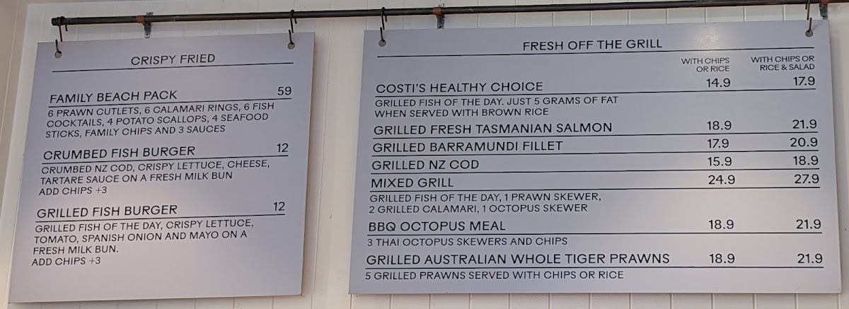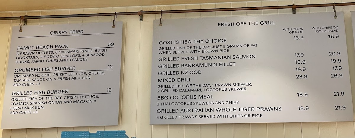 From a reviewer’s perspective, the menu at Costi’s Fish And Chips At Coogee offers a well-rounded selection that caters to both classic takeaway lovers and those looking for hearty seafood meals. The mains, such as the Mixed Grill, Grilled Fish Of The Day, BBQ Octopus Meal, Battered King Prawn Box, and Kids Pack, provide a solid variety of grilled and fried options, while the burgers like the Grilled Fish Burger and Crumbed Fish Burger are great casual choices. The family options, including the Fried Party Pack, Family Beach Pack, Mega Grill Pack, and Grilled & Fried Meal Deal, are especially appealing for groups. Lighter options are available with salads like Prawn And Avocado, Seafood Salad, Tabouli, Greek Salad, and Garden Salad. To complement the meals, there are add-ons such as Spring Rolls, 3 Potato Scallops, 3 BBQ King Prawns, Chips, and 3 Pineapple Fritters, along with sauces like Sweet Chilli Sauce, Tomato Sauce, Hot Sauce, Aioli Sauce, and Peri Peri Sauce. Drinks including Water, Sparkling Water, Coke Vanilla 600mL, Lift 600mL, and Powerade round out the menu, making it a convenient and satisfying spot for a classic fish and chips experience by the beach.